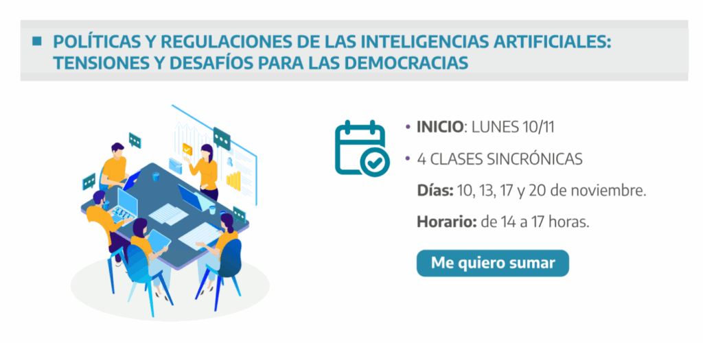 La semana que viene, iniciando el 10 de noviembre, tengo el gusto de ofrecer el curso “Políticas y Regulaciones de las Inteligencias Artificiales: tensiones y desafíos para las democracias” que organiza el Instituto Provincial de Administración Pública (IPAP) de la Provincia de Buenos Aires. El objetivo general del curso es fortalecer las capacidades de las y los trabajadoras/es públicas/os para comprender y contextualizar los marcos regulatorios y políticos que rigen el uso de la inteligencia artificial. Enlace para inscripciones. Más información (pdf). El IPAP contribuye con la formación y la investigación en administración pública provincial y municipal con un enfoque que incluye desarrollar estudios académicos que impulsan la excelencia en la gestión pública.